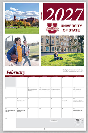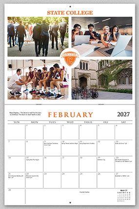 Easily create a custom wall calendar with all your college events, images, and colors. Choose from 6 versatile formats, add your photos, events, and holidays. Each page can include your mascot/logo and school name.